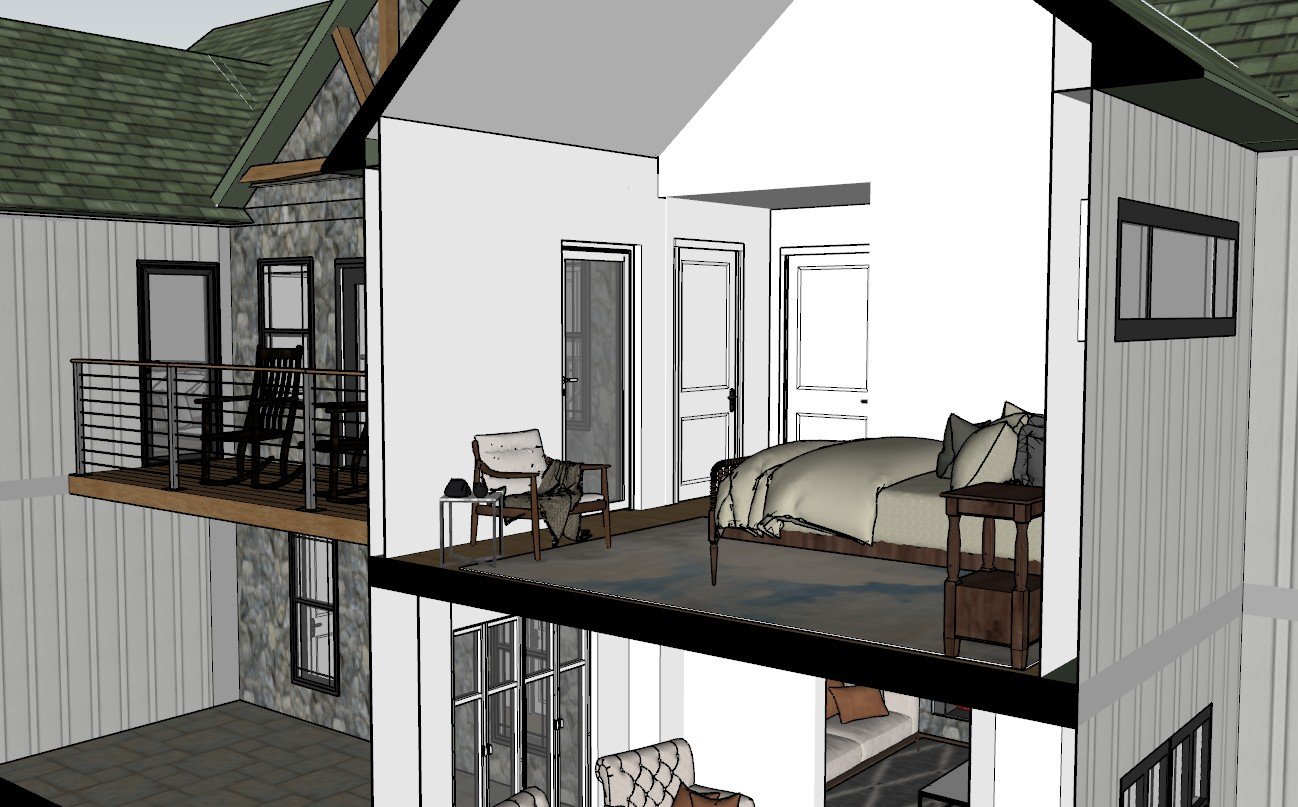 Three-dimensional modeling allowed the homeowners to evaluate ceiling heights, balcony proportions, and structural transitions before framing began.